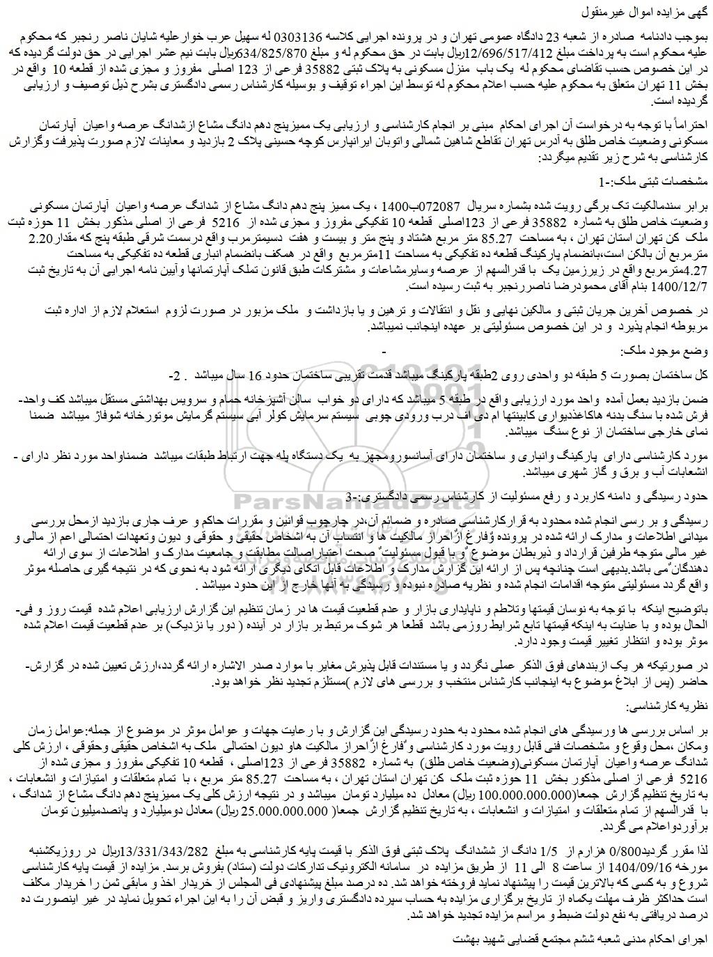 بموجب دادنامه صادره از شعبه 23 دادگاه عمومی تهران و در پرونده اجرایی کلاسه 0303136 له سهیل عرب خوارعلیه شایان ناصر رنجبر که محکوم علیه محکوم است به پرداخت مبلغ 12/696/517/412ریال بابت در حق محکوم له و مبلغ 634/825/870ریال بابت نیم عشر اجرایی در حق دولت گردیده که در این خصوص حسب تقاضای محکوم له یک باب منزل مسکونی به پلاک ثبتی 35882 فرعی از 123 اصلی مفروز و مجزی شده از قطعه 10 واقع در بخش 11 تهران متعلق به محکوم علیه حسب اعلام محکوم له توسط این اجراء توقیف و بوسیله کارشناس رسمی دادگستری بشرح ذیل توصیف و ارزیابی گردیده است.