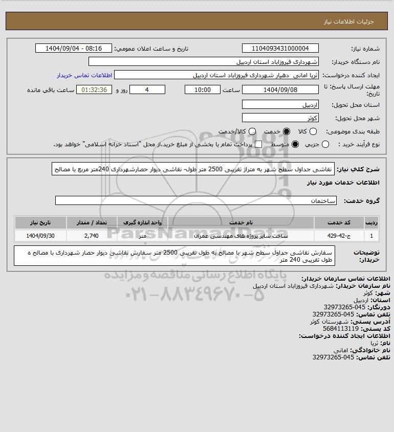 شرح کلی نیاز: نقاشی جداول سطح شهر به متراژ تقریبی 2500 متر طول- نقاشی دیوار حصارشهرداری 240متر مربع با مصالح