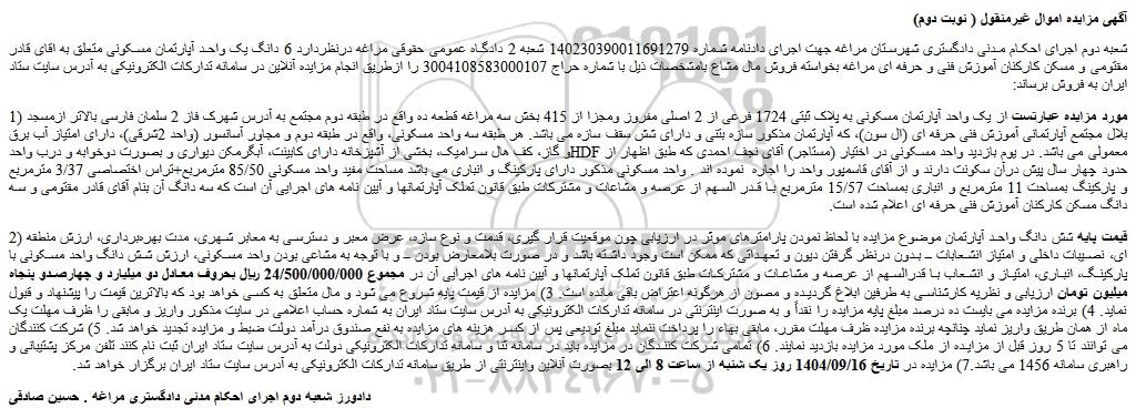 مزایده یک واحد آپارتمان مسکونی به پلاک ثبتی 1724 فرعی از 2 اصلی مفروز ومجزا از 415, مزایده یک واحد آپارتمان مسکونی به پلاک ثبتی 1724 فرعی از 2 اصلی مفروز ومجزا از 415