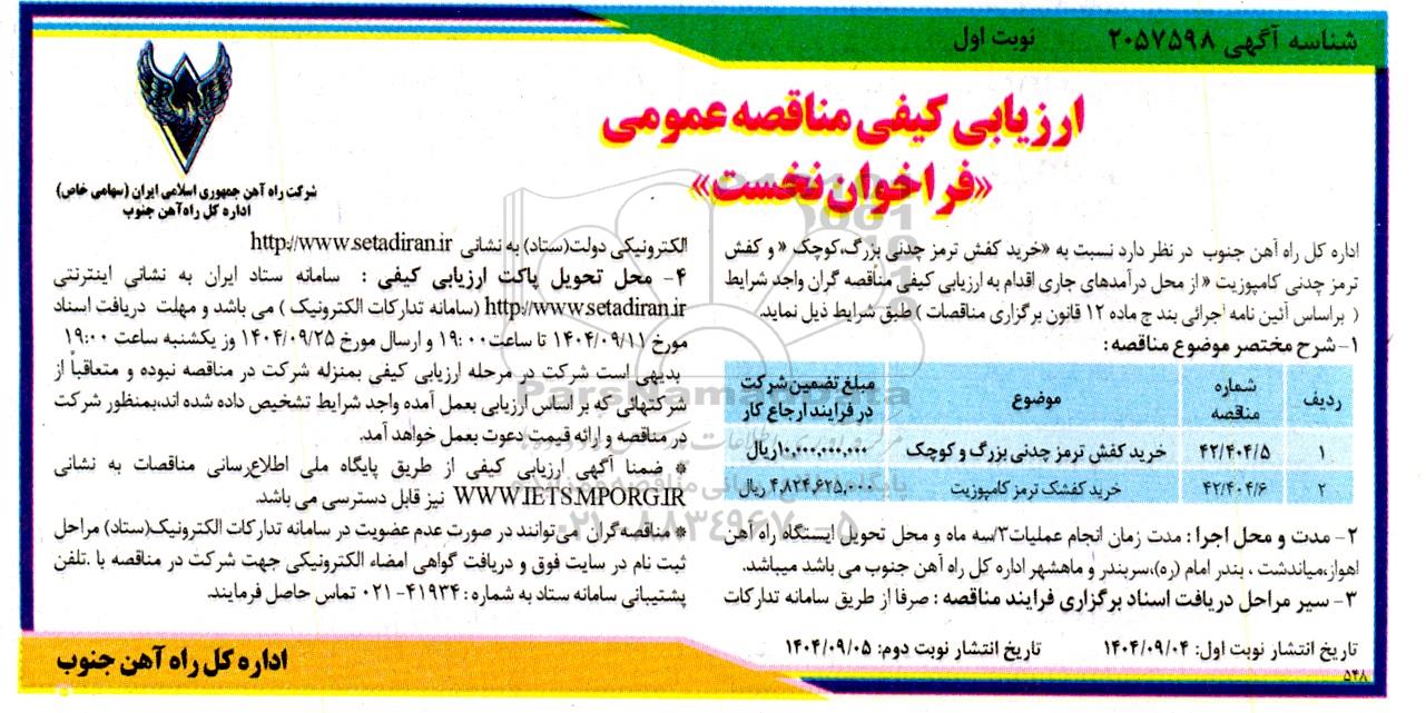 اداره کل راه آهن جنوب در نظر دارد نسبت به خرید کفش ترمز چدنی بزرگ، کوچک و کفش ترمز چدنی کامپوزیت از محل درآمدهای جاری اقدام به ارزیابی کیفی مناقصه گران واجد شرایط (براساس 11 آئین نامه اجرایی بند ج ماده 12 قانون برگزاری مناقصات) طبق شرح ذیل نماید.