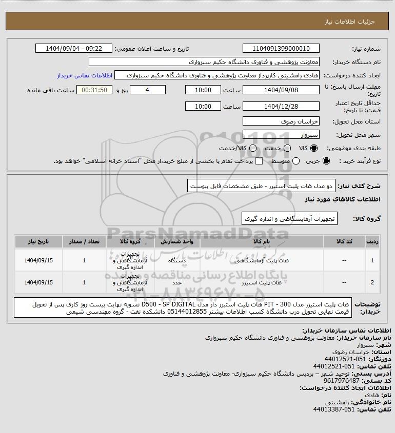 | 2 | -- | هات پلیت استیرر | عدد | تجهیزات آزمایشگاهی و اندازه گیری | 1 | 1404/09/15 |