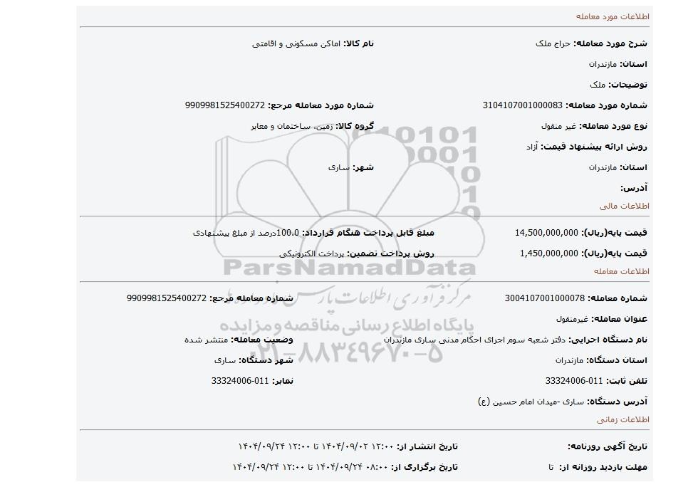 | شرح مورد معامله: حراج ملک | نام کالا: اماکن مسکونی و اقامتی | |