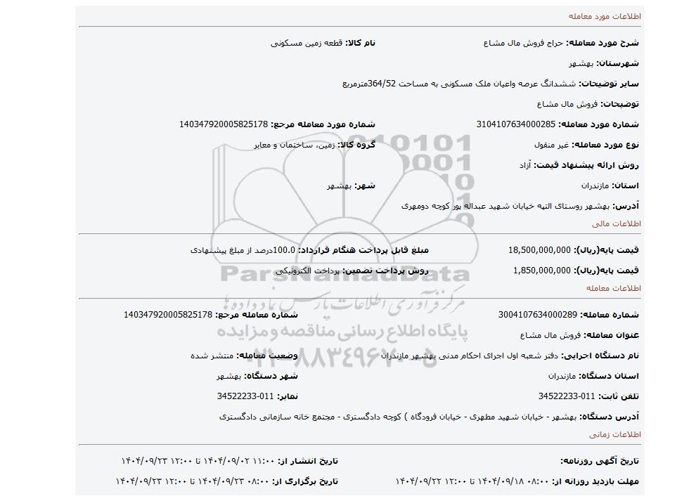 مزایده عمومی مزایده فروش مال مشاع برگزار میگردد. از کلیه افراد متخصص و شرکت‌های واجد شرایط دعوت به عمل می‌آید تا در این مزایده با کد خبرگزاری پارس نماد : 9900095 شرکت نمایند تاریخ شروع مزایده : 1404/09/02 مهلت شرکت در مزایده: تا پایان روز 1404/09/23 مکان برگزاری اموال واگذاری استان‌های مازندران و دسته‌بندی‌های مربوط به این حراجی املاک و زمین میباشد.