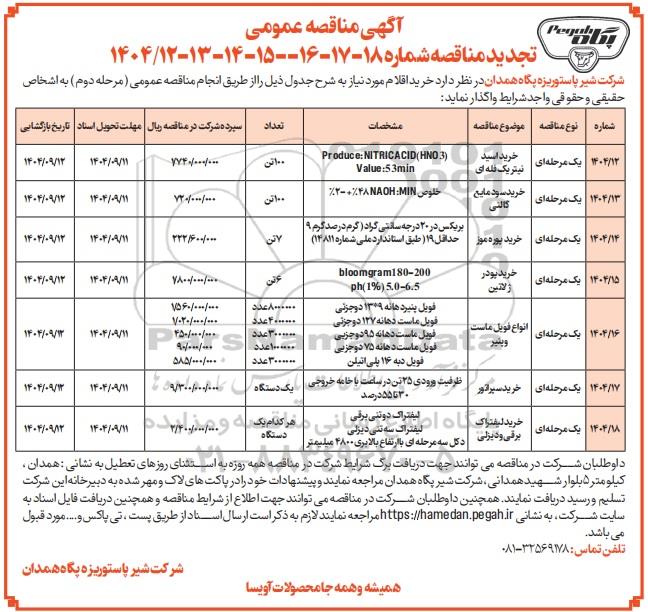 شرکت شیر پاستوریزه پگاه همدان در نظر دارد خرید اقلام مورد نیاز به شرح جدول ذیل را از طریق انجام مناقصه عمومی (مرحله دوم) به اشخاص حقیقی و حقوقی واجد شرایط واگذار نماید.