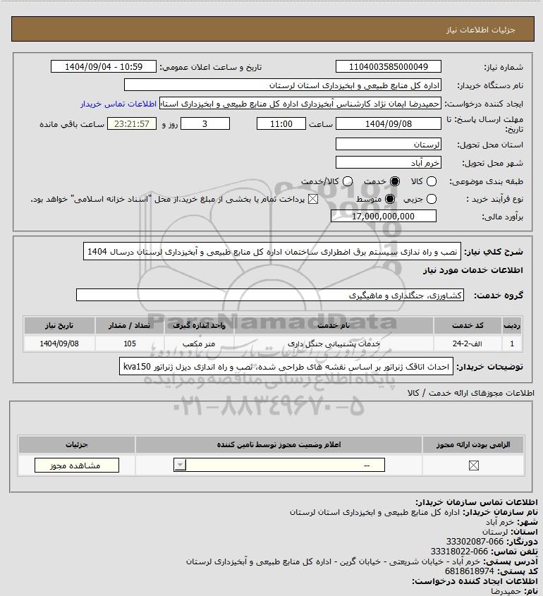 شرح کلی نیاز: نصب و راه ندازی سیستم برق اضطراری ساختمان اداره کل منابع طبیعی و آبخیزداری لرستان درسال 1404
