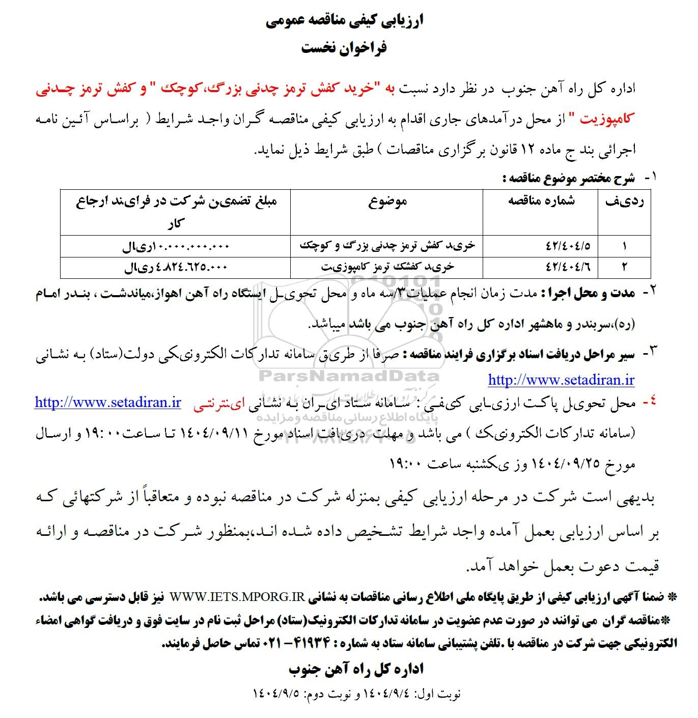 اداره کل راه آهن جنوب در نظر دارد نسبت به خرید کفش ترمز چدنی بزرگ، کوچک و کفش ترمز چدنی کامپوزیت از محل درآمدهای جاری اقدام به ارزیابی کیفی مناقصه گران واجد شرایط (براساس 11 آئین نامه اجرایی بند ج ماده 12 قانون برگزاری مناقصات) طبق شرح ذیل نماید.