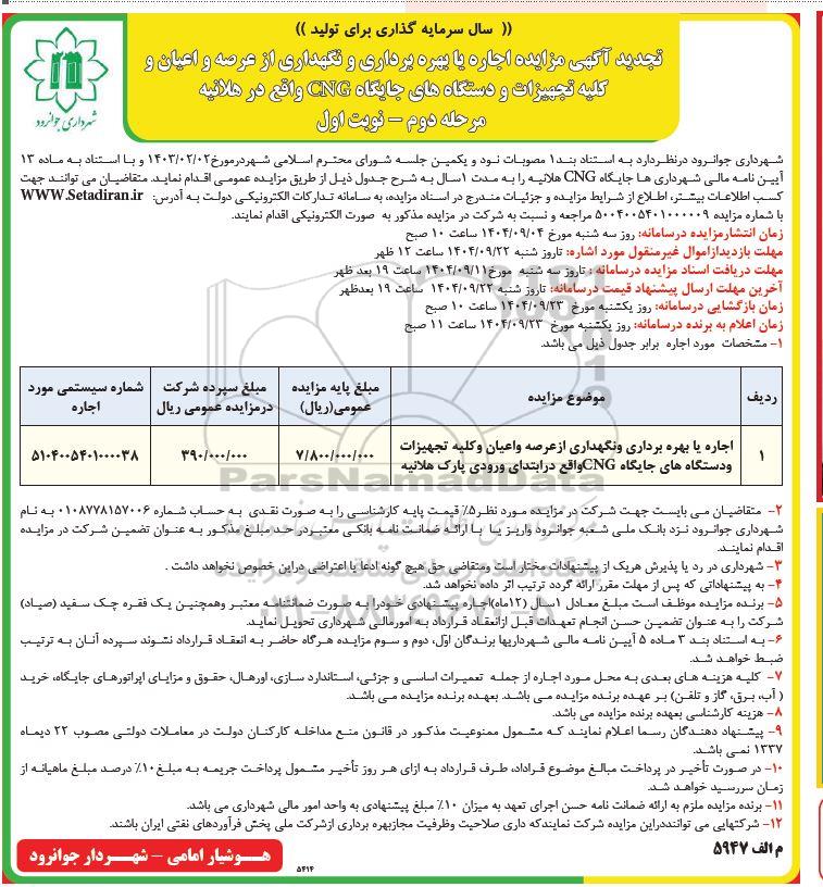 شهرداری جوانرود در نظر دارد به استناد بند 1 مصوبات نود و یکمین جلسه شورای محترم اسلامی شهر در مورخ 1403.02.02 و یا استناد به ماده 13 آیین نامه مالی شهرداریها جایگاه CNG هلائیه را به مدت اسال به شرح جدول ذیل از طریق مزایده عمومی اقدام نماید. متقاضیان می توانند جهت کسب اطلاعات بیشتر اطلاع از شرایط مزایده و جزئیات مندرج در اسناد مزایده به سامانه تدارکات الکترونیکی دولت به آدرس ستاد ایران یا شماره مزایده 5004005401000009 مراجعه و نسبت به شرکت در مزایده مذکور به صورت الکترونیکی اقدام نمایند.