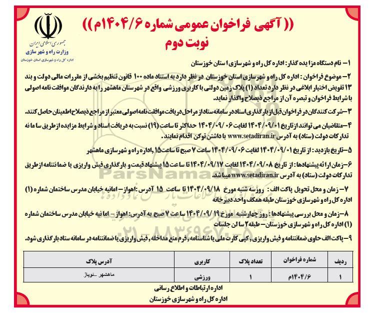 2- موضوع فراخوان : اداره کل راه و شهرسازی استان خوزستان در نظر دارد به استناد ماده 100 قانون تنظیم بخشی از مقررات مالی دولت و بند 13 تفویض اختیار ابلاغی در نظر دارد تعداد (1) پلاک زمین دولتی با کاربری ورزشی واقع در شهرستان ماهشهر را به دارندگان موافقت نامه اصولی با شرایط فراخوان و تبصره آن از مراجع ذیصلاح واگذار نماید.