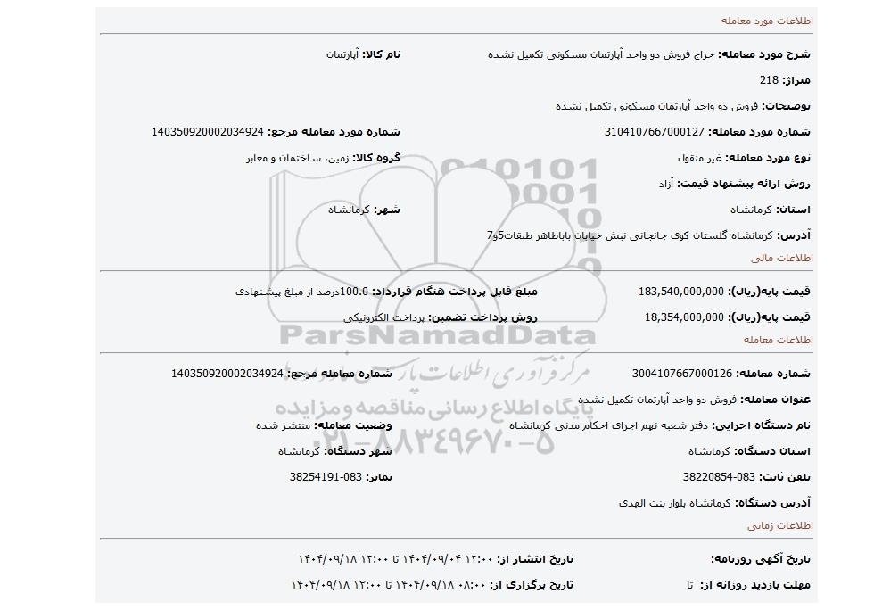 | شرح مورد معامله: حراج فروش دو واحد آپارتمان مسکونی تکمیل نشده | نام کالا: آپارتمان | |