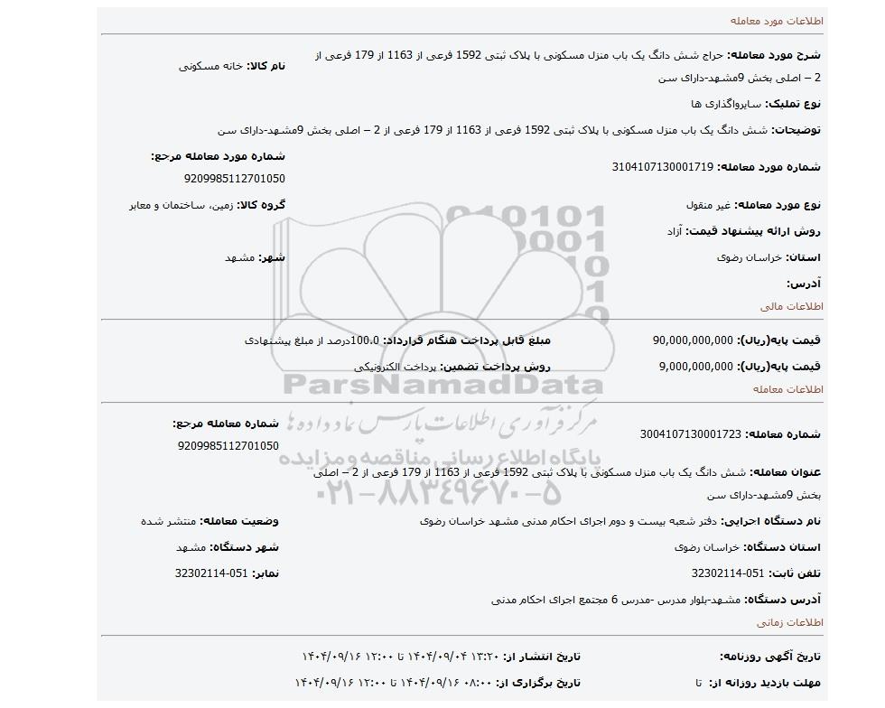 | شرح مورد معامله: حراج شش دانگ یک باب منزل مسکونی با پلاک ثبتی 1592 فرعی از 1163 از 179 فرعی از 2 – اصلی بخش 9مشهد-دارای سن | نام کالا: خانه مسکونی | |