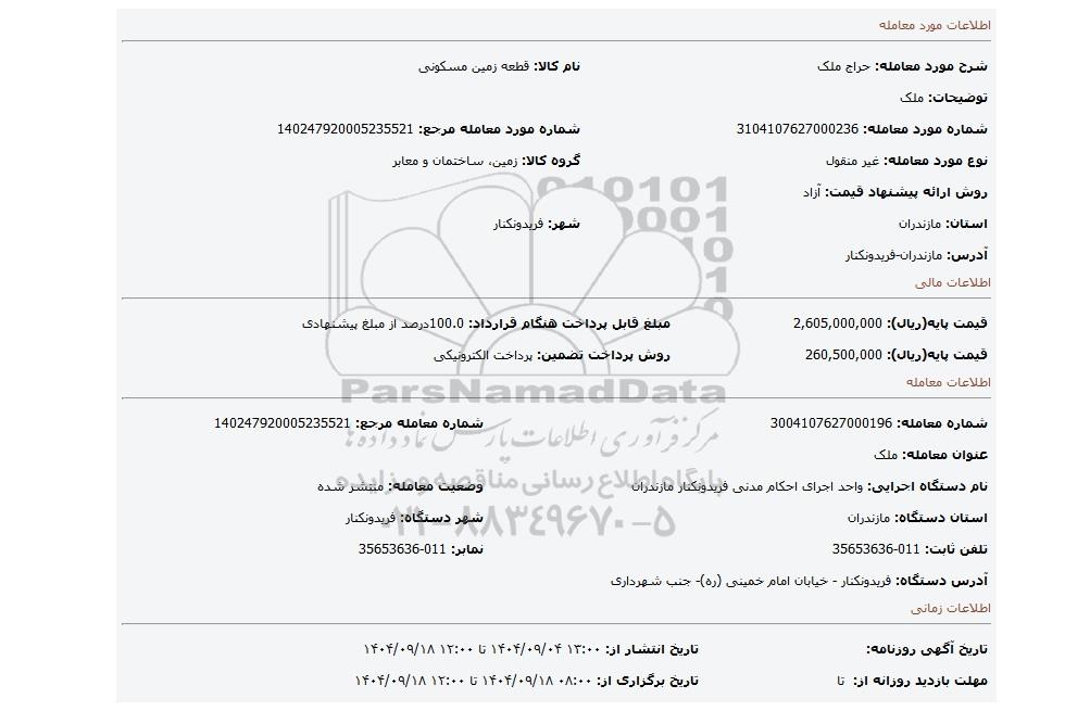 | شماره مورد معامله: 3104107627000236 | شماره مورد معامله مرجع: 140247920005235521 | |