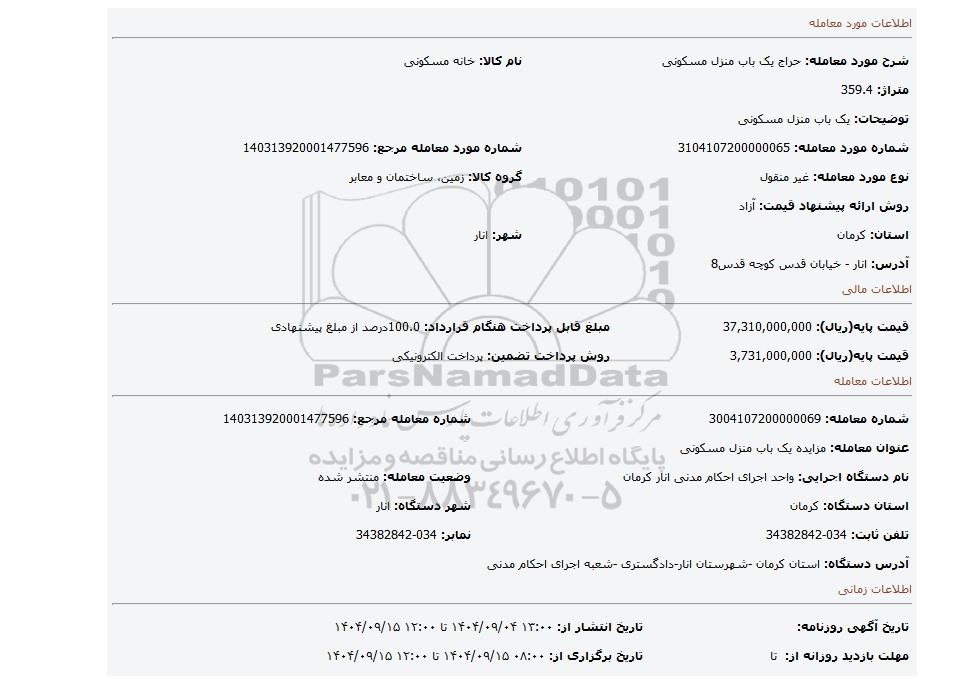 | شرح مورد معامله: حراج یک باب منزل مسکونی | نام کالا: خانه مسکونی | |