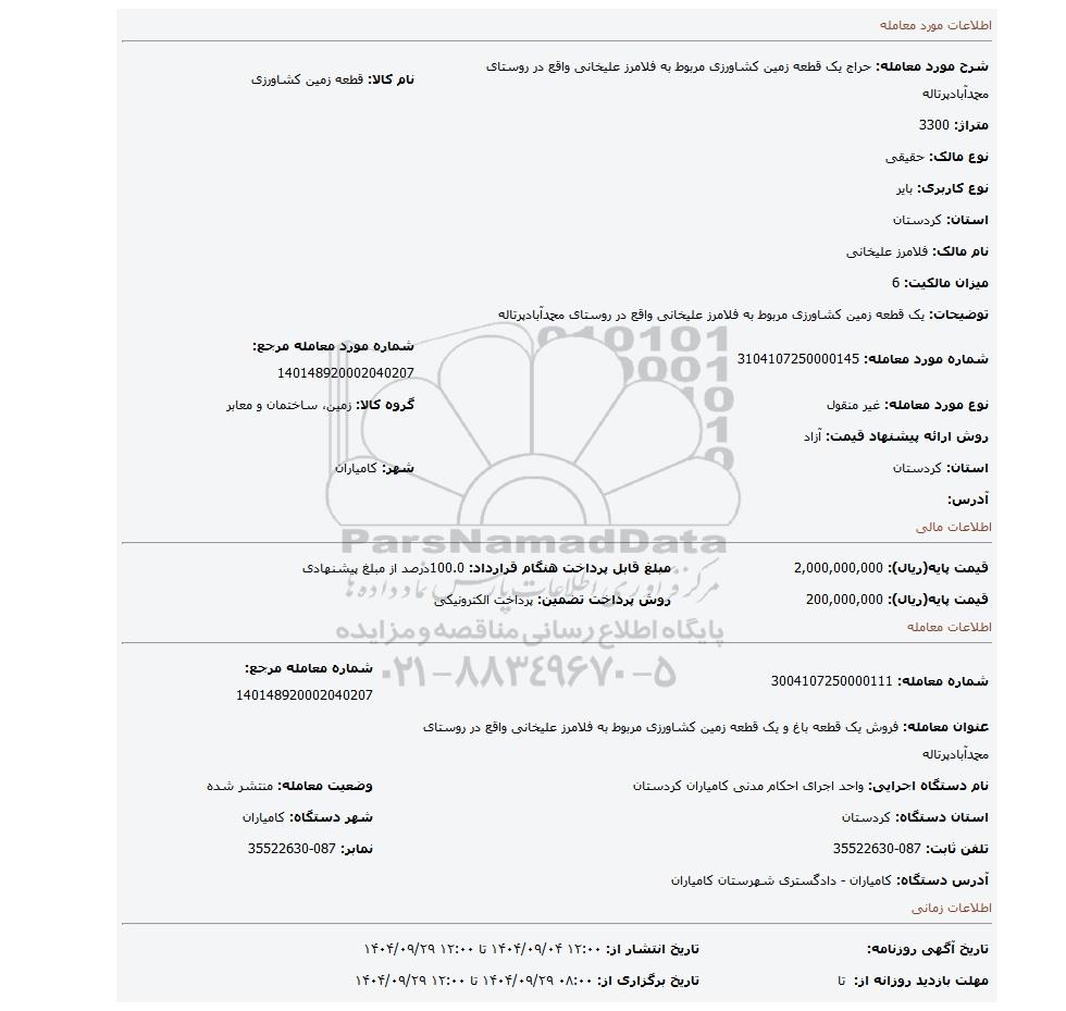 | عنوان معامله: فروش یک قطعه باغ و یک قطعه زمین کشاورزی مربوط به فلامرز علیخانی واقع در روستای محمدآبادپرتاله | ||