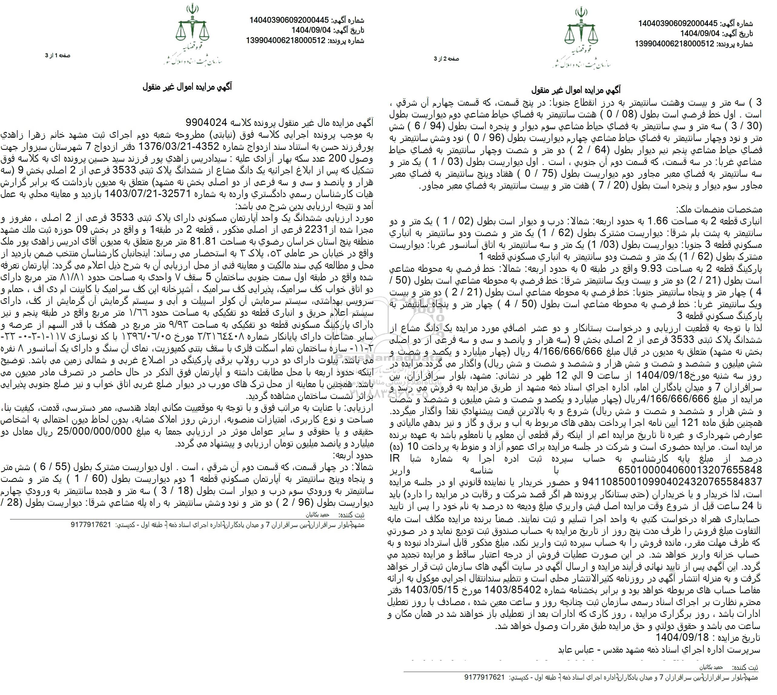 آگهی مزایده مال غیر منقول پرونده کلاسه 9904024 به موجب پرونده اجرایی کلاسه فوق (نیابتی) مطروحه شعبه دوم اجرای ثبت مشهد خانم زهرا زاهدی یور فرزند حسن به استناد سند ازدواج شماره 4352-1376.03.21 دفتر ازدواج 7 شهرستان سبزوار جهت وصول 200 عدد سکه بهار آزادی علیه : سید ادریس زاهدی پور فرزند سید حسین پرونده ای به کلاسه فوق تشکیل که پس از ابلاغ اجرائیه یک دانگ مشاع از ششدانگ پلاک ثبتی 3533 فرعی از 2 اصلی بخش 9 سه هزار و پانصد و سی و سه فرعی از دو اصلی بخش به مشهد متعلق به مدیون بازداشت که برابر گزارش هیات کارشناسان رسمی دادگستری وارده به شماره 32571-1403.07.21 بازدید و معاینه محلی به عمل آمد و نتیجه ارزیابی بدین شرح می باشد.