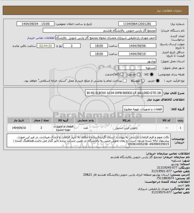 شرح کلی نیاز: 28 IN NS ELBOW A234-WPB-90DEG-LR WELDED-STD