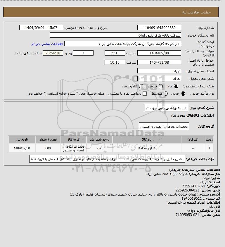 شرح کلی نیاز: البسه ورزشی طبق پیوست