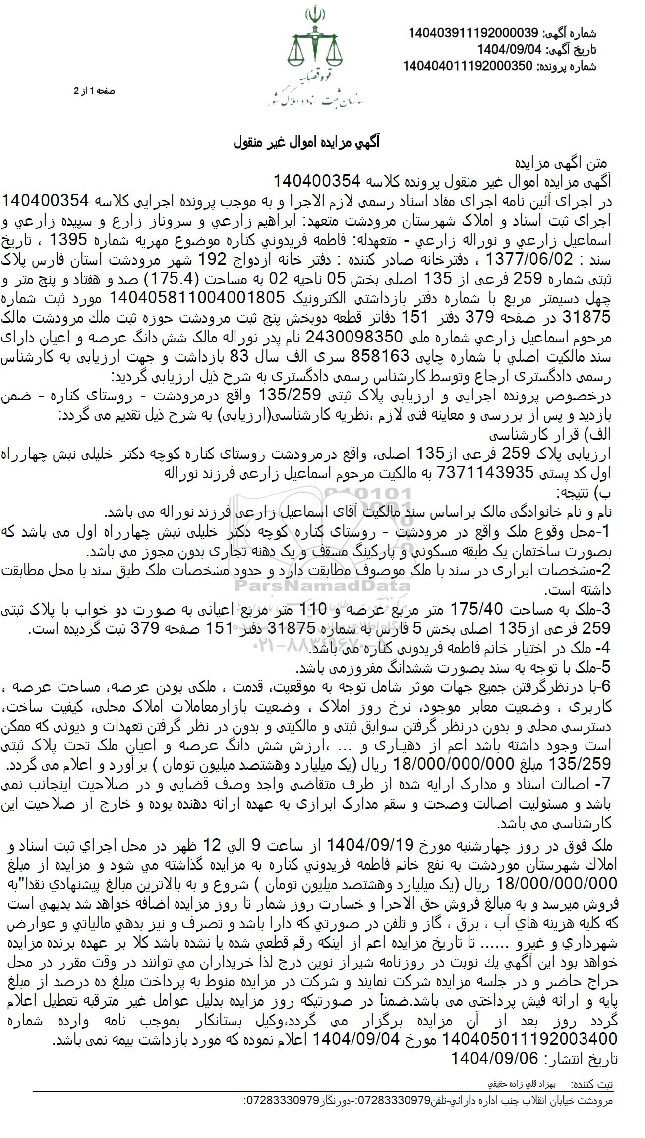 در اجرای آئین نامه اجرای مفاد اسناد رسمی لازم الاجرا و به موجب پرونده اجرایی کلاسه 140400354 اجرای ثبت اسناد و املاک شهرستان مرودشت متعهد ابراهیم زارعی و سروناز زارع و سپیده زارعی و اسماعیل زارعی و نوراله زارعی - متعهدله فاطمه فریدونی کناره موضوع مهریه شماره 1395 ، تاریخ سند : 1377.06.02 ، دفترخانه صادر کننده : دفتر خانه ازدواج 192 شهر مرودشت استان فارس پلاک ثبتی شماره 259 فرعی از 135 اصلی بخش 05 ناحیه 02 به مساحت (175.4) صد و هفتاد و پنج متر و چهل دسیمتر مربع با شماره دفتر بازداشتی الکترونیک 140405811004001805 مورد ثبت شماره 31875 در صفحه 379 دفتر 151 دفاتر قطعه دو بخش پنج ثبت مرودشت حوزه ثبت ملك مرودشت مالک مرحوم اسماعیل زارعی شماره ملی 2430098350 نام پدر نوراله مالک شش دانگ عرصه و اعیان دارای سند مالكیت اصلی با شماره چاپی 858163 سری الف سال 83 بازداشت و جهت ارزیابی به کارشناس رسمی دادگستری ارجاع و توسط کارشناس رسمی دادگستری به شرح ذیل ارزیابی گردید