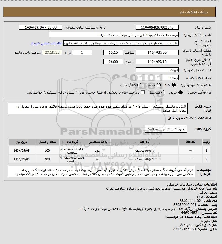 شرح کلی نیاز: لارنژیال ماسک سیلیکونی سایز 3 و 4 هرکدام یکصد عدد عدد عدد جمعا 200 عدد/ تسویه فاکتور دوماه پس از تحویل / تحویل انبار میلاد