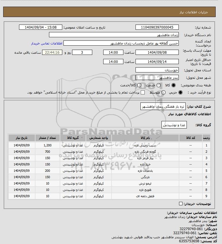 شرح کلی نیاز: تره بار هفتگی زندان ماهشهر