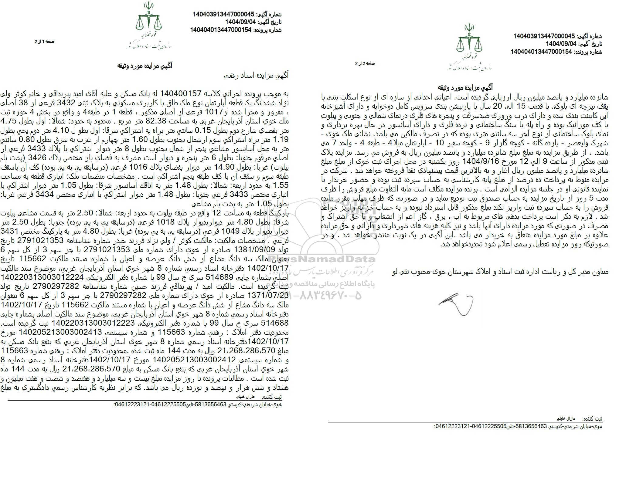 پارکینگ قطعه به مساحت 12 واقع در طبقه پیلوت به حدود اربعه شمالا : 2.50 متر به قسمت مشاعی پیلوت شرقا بطول 4.80 متر دیوار بدیوار یلاک 1018 فرعی در سابقه پی به پی بوده جنوبا بطول 2.50 متر دیوار بدیوار پلاک 1049 فرعی در سابقه پی به یی بوده غربا بطول 4.80 متر به پارکینگ مختص 3431 فرعی . مشخصات مالکیت مالکیت کوتر . ولی نژاد فرزند حیدر شماره شناسنامه 2791021353 تاریخ تولد 1381.09.09 صادره از خوی دارای شماره ملی 2791021353 با جز سهم 3 از کل سهم 6 بعنوان مالک سه دانگ مشاع از شش دانگ عرصه و اعیان با شماره مستند مالکیت 115662 تاریخ 1402.10.17 دفترخانه اسناد رسمی شماره 8 شهر خوی استان آذربایجان غربی موضوع سند مالکیت اصلی بشماره چاپی 514689 سرک ج سال 99 با شماره دفتر الکترونیکی 140220313003012224 ثبت گردیده است. مالکیت امید . بیربداقی فرزند حسین شماره شناسنامه 2790297282 تاریخ تولد 1371.07.23 صادره از خوی دارای شماره ملی 2790297282 با جز سهم 3 از گل سهم 6 بعنوان مالک سه دانگ مشاع از شش دانگ عرصه و اعیان با شماره مستند مالکیت 115662 تاریخ 1402.10.17 دفترخانه اسناد رسمی شماره 8 شهر خوی استان آذربایجان غربی، موضوع سند مالکیت اصلی بشماره چاپی 514688 سری ج سال 99 با شماره دفتر الکترونیکی 140220313003012223 ثبت گردیده است. محدودیت دفتر املاک : رهنی شماره 115663 و شماره سیستمی 140205213003002413 مورخ 1402.10.17 دفترخانه اسناد رسمی شماره 8 شهر خوی استان آذربایجان غربی که بنفع بانک مسکن به مبلغ 21,268,286,570 ریال به مدت 144 ماه ثبت شده محدودیت دفتر املاک : رهنی شماره 115663 و شماره سیستمی 140205213003002412 مورخ 1402.10.17 دفترخانه اسناد رسمی شماره 8 شهر خوی استان آذربایجان غربی که بنفع بانک مسکن به مبلغ 21,268,286,570 ریال به مدت 144 ماه ثبت شده است . مطالبات پرونده تا روز مزایده مبلغ بیست و سه میلیارد و هفتصد و شصت و هفت میلیون و هشتاد و شش هزار و نهصد و نوزده ریال می باشد که برابر نظریه کارشناس رسمی دادگستری به مبلغ شانزده میلیارد و پانصد میلیون ریال ارزیابی گردیده است. اعیانی احداثی از سازه ای از نوع اسکلت بتنی با یقف تیرچه ای بلوکی با قدمت 15 الی 20 سال با پارتیشن بندی سرویس کامل دوخوابه و دارای آشپزخانه این کابینت بندی شده و دارای درب وروری ضد سرقت و پنجره های فلزی در نمای شمالی و جنوبی و پیلوت با کف موزائیک بوده و راه پله با سنگ ساختمانی و نرده فلزی و دارای آسانسور در حال بهره برداری و نمای بلوک ساختمانی از نوع آجر سه سانتی متری بوده که در تصرف مالکین میباشد. نشانی ملک خوی -شهرک ولیعصر - یازده گانه - کوچه گلزار 9 - کوچه سفیر 10 - اپارتمان میلا 4 - طبقه 4 - واحد 7 می باشد، از طریق مزایده به مبلغ مبلغ شانزده میلیارد و پانصد میلیون ریال به فروش می رسد. مزایده پلاک ثبتى مذکور از ساعت 9 الی 12 مورخ 1404.9.16 روز یکشنبه در محل اجرای ثبت خوی از مبلغ مبلغ شانزده میلیارد و پانصد میلیون ریال آغاز و به بالاترین قیمت پیشنهادی نقداً فروخته خواهد شد . شرکت در مزایده منوط به پرداخت ده درصد از مبلغ پایه کارشناسی به حساب سپرده ثبت بوده و حضور خریدار یا نماینده قانونی او در جلسه مزایده الزامی است. برنده مزایده مکلف است ما به التفاوت مبلغ فروش را ظرف مدت 5 روز از تاریخ مزایده به حساب صندوق ثبت تودیع نماید و در صورتی که ظرف مهلت مقرر مانده فروش را به حساب سپرده ثبت واریز نکند مبلغ مذکور قابل استرداد نبوده و به حساب خزانه واریز خواهد شد . لازم به ذکر است پرداخت بدهیهای مربوط به آب ، برق ، گاز اعم از انشعاب و یا حق اشتراک و مصرف در صورتی که مورد مزایده دارای آنها باشد و نیز کلیه هزینه های شهرداری و دارائی و حق مزایده علاوه بر مبلغ مورد مزایده متعلق به خریدار میباشد این آگهی در یک نوبت منتشر خواهد شد . و در صورتیکه روز مزایده تعطیل رسمی اعلام شود تجدید خواهد شد.