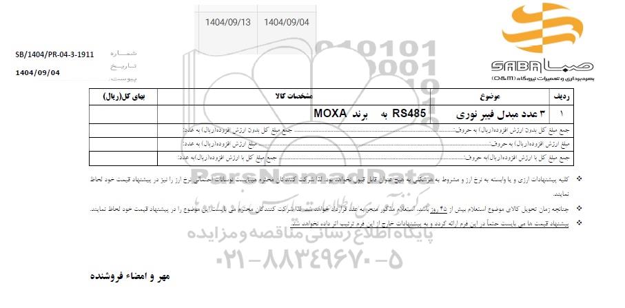 استعلام بها و موضوع استعلام استعلام 6 عدد مبدل فیبر نوری به اطلاع کلیه شرکتها و افراد متخصص واجد شرایط میرساند، آگهی گذار در نظر دارد از طریق استعلام بها، نسبت به انتخاب و دریافت پیشنهادات اقدام نماید. این استعلام با کد آگهی ثبت شده در سامانه خبرگزاری پارس نماد : 9902498 منتشر شده است. مشخصات استعلام : تاریخ شروع استعلام: 1404/09/04 آخرین مهلت ارسال پیشنهاد قیمت : 1404/09/13 و محل اجرای پروژه : استان مناقصات استان سایر میباشد. استعلام قیمت مورد درخواست : استعلام 6 عدد مبدل فیبر نوری با دستهبندیهای تخصصی و گروه های مرتبط : کامپیوتر, اینترنت شبکه, تجهیزات مخابرات, استعلام اطلاع رسانی میگردد.