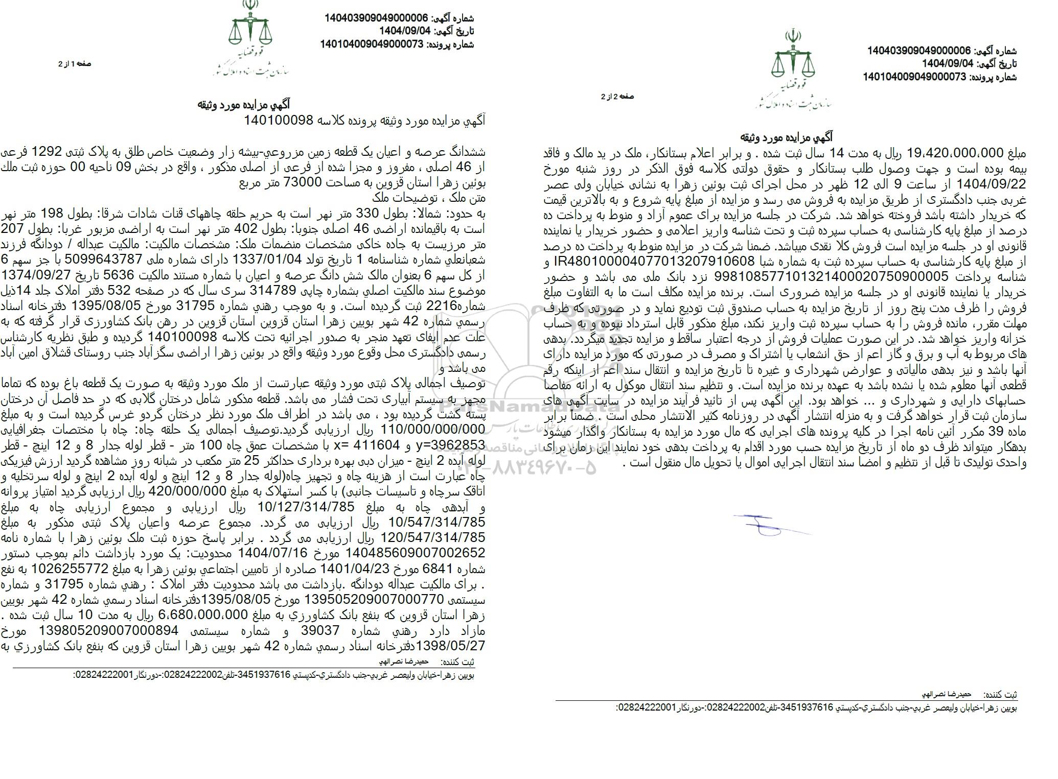 مزایده ششدانگ عرصه و اعیان یک قطعه زمین مزروعی بیشه زار , مزایده ششدانگ عرصه و اعیان یک قطعه زمین مزروعی بیشه زار