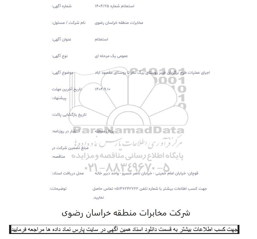 موضوع آگهی: اجرای عملیات طرح برگردان فیبر روستای بیگ نظر تا روستای مقصود آباد