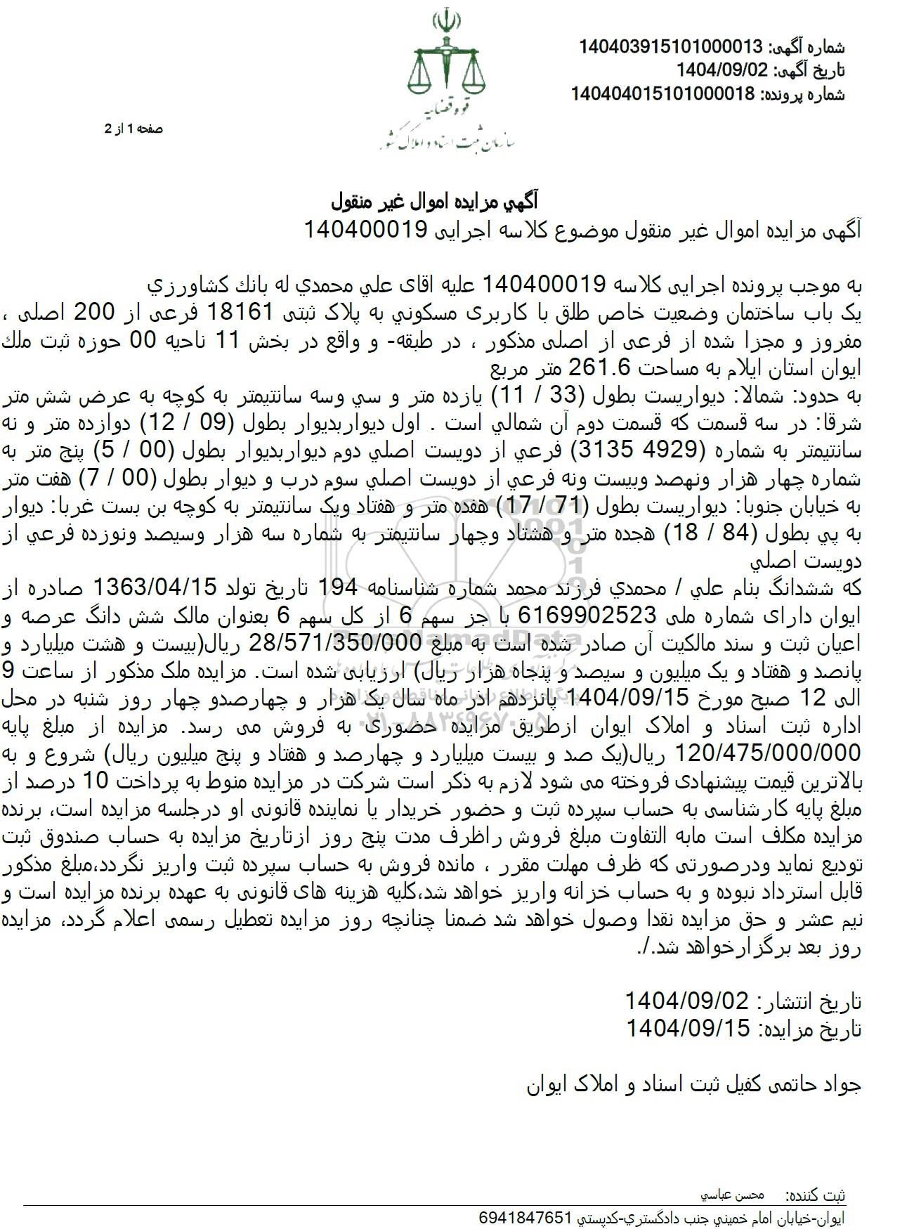 که ششدانگ بنام علی/ محمدیفرزند محمد شماره شناسنامه 194 تاریخ تولد 1363.04.15 صادره از ایوان دارای شماره ملی 6169902523 با جز سهم 6 از کل سهم 6 بعنوان مالک شش دانگ عرصه و اعیان ثبت و سند مالکیت آن صادر شده است به مبلغ 28.571.350.000 ریال (بیست و هشت میلیارد و پانصد و هفتاد و یک میلیون و سیصد و پنجاه هزار ریال) ارزیابی شده است. مزایده ملک مذکور از ساعت 9 الى 12 صبح مورخ 1404.09.15 پانزدهم آذر ماه سال یک هزار و چهارصد و چهار روز شنبه در محل اداره ثبت اسناد و املاک ایوان از طریق مزایده حضوری به فروش میرسد. مزایده از مبلغ پایه 120.475.000.000 ریال (یک صد و بیست میلیارد و چهارصد و هفتاد و پنج میلیون ریال) شروع و به بالاترین قیمت پیشنهادی فروخته میشود لازم به ذکر است شرکت در مزایده منوط به پرداخت 10 درصد از مبلغ پایه کارشناسی به حساب سپرده ثبت و حضور خریدار یا نماینده قانونی او در جلسه مزایده است. برنده مزایده مکلف است ما به التفاوت مبلغ فروش را ظرف مدت پنج روز از تاریخ مزایده به حساب صندوق ثبت تودیع نماید و در صورتی که ظرف مهلت مقرر ، مانده فروش به حساب سپرده ثبت واریز نگردد، مبلغ مذکور قابل استرداد نبوده و به حساب خزانه واریز خواهد شد کلیه هزینه های قانونی به عهده برنده مزایده است و نیم عشر و حق مزایده نقدا وصول خواهد شد ضمنا چنانچه روز مزایده تعطیل رسمی اعلام گردد، مزایده روز بعد برگزار خواهد شد.