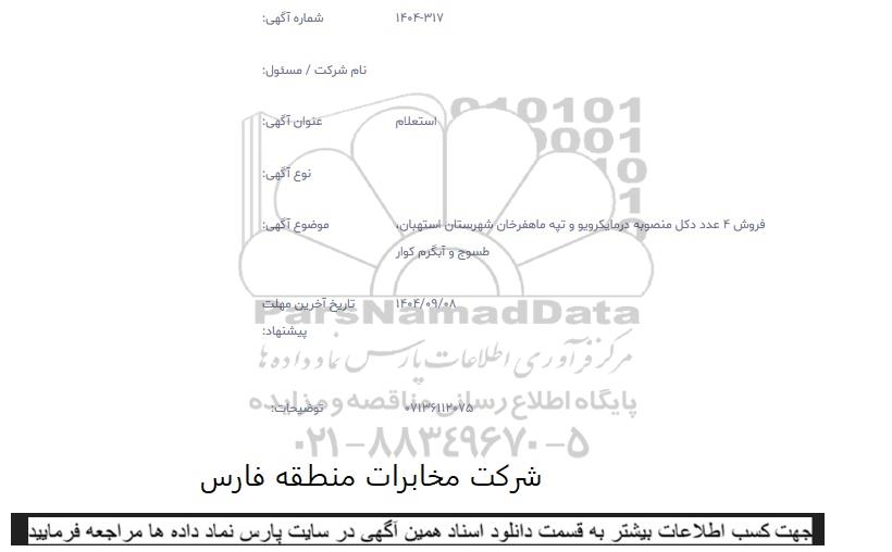 مزایده عمومی استعلام فروش 4 عدد دکل منصوبه درمایکرویو و تپه ماهفرخان شهرستان استهبان، طسوج و آبگرم کوار برگزار میگردد. از کلیه افراد متخصص و شرکت‌های واجد شرایط دعوت به عمل می‌آید تا در این مزایده با کد خبرگزاری پارس نماد : 9902541 شرکت نمایند تاریخ شروع مزایده : 1404/09/04 مهلت شرکت در مزایده: تا پایان روز 1404/09/08 مکان برگزاری اموال واگذاری استان‌های مزایدات استان فارس و دسته‌بندی‌های مربوط به این حراجی مخابرات, آهن آلات میباشد.