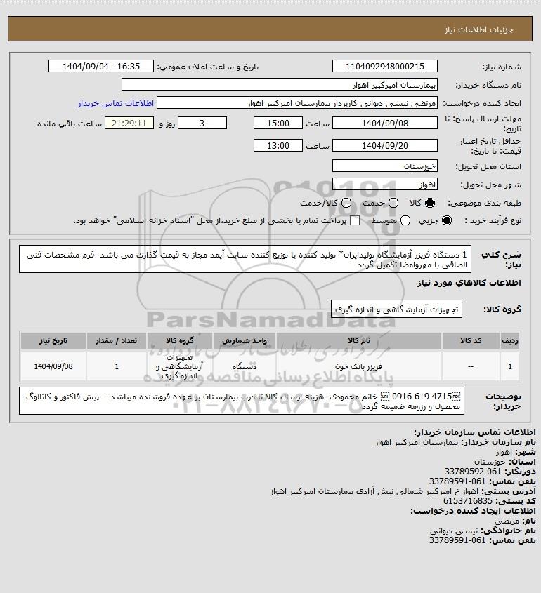 | 1 | -- | فریزر بانک خون | دستگاه | تجهیزات آزمایشگاهی و اندازه گیری | 1 | 1404/09/08 |