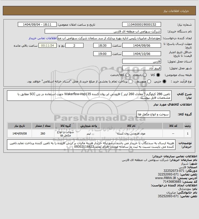 شرح کلی نیاز: تامین 286 کیلوگرم ( معادل 260 لیتر ) افزودنی ابر روان کننده Wakerflow-Hsp135 جهت استفاده در بتن SCC مطابق با مشخصات فایل پیوست