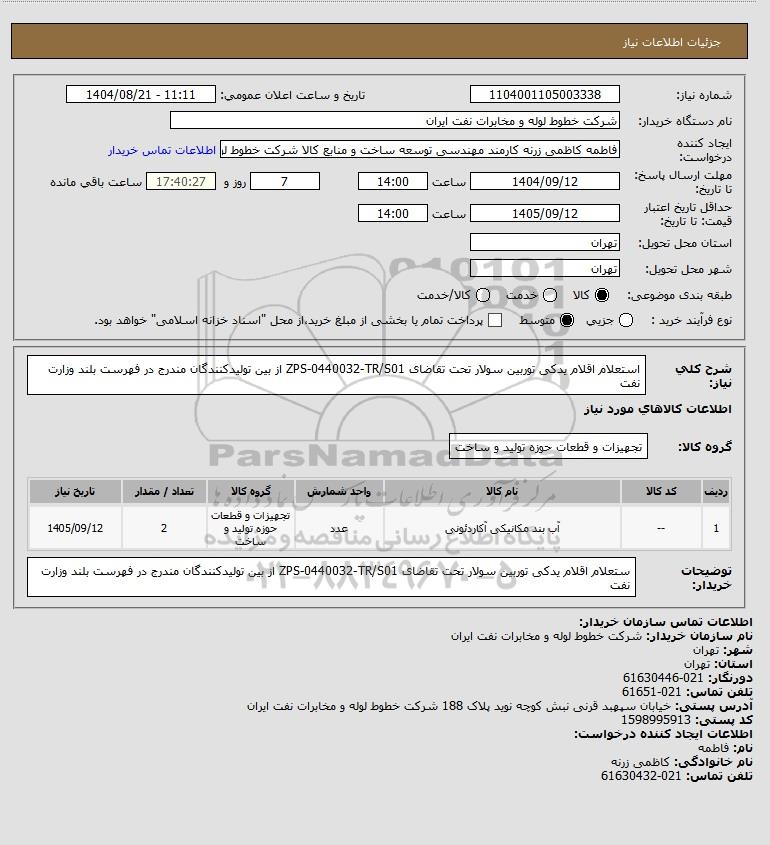 شرح کلی نیاز: استعلام اقلام یدکی توربین سولار تحت تقاضای ZPS-0440032-TR/S01 از بین تولیدکنندگان مندرج در فهرست بلند وزارت نفت