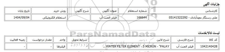 | علی رستگار محمدآبادی - 05141522292 | 166644 | فیلتر المنت آب | استعلام الکترونیکی | 1404/09/04 |