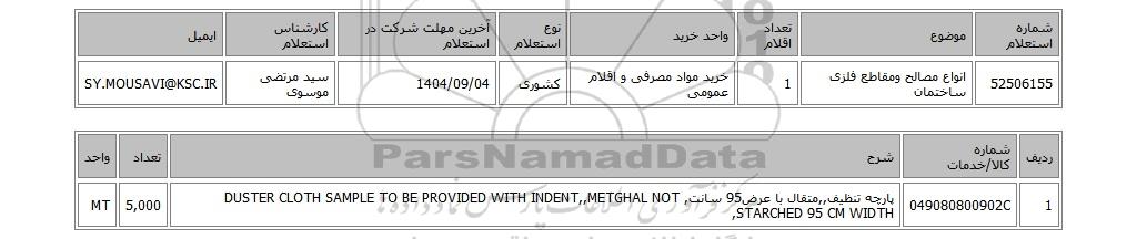 | 52506155 | انواع مصالح ومقاطع فلزی ساختمان | 1 | خرید مواد مصرفی و اقلام عمومی | کشوری | 1404/09/04 | سید مرتضی موسوی | SY.MOUSAVI@KSC.IR |
