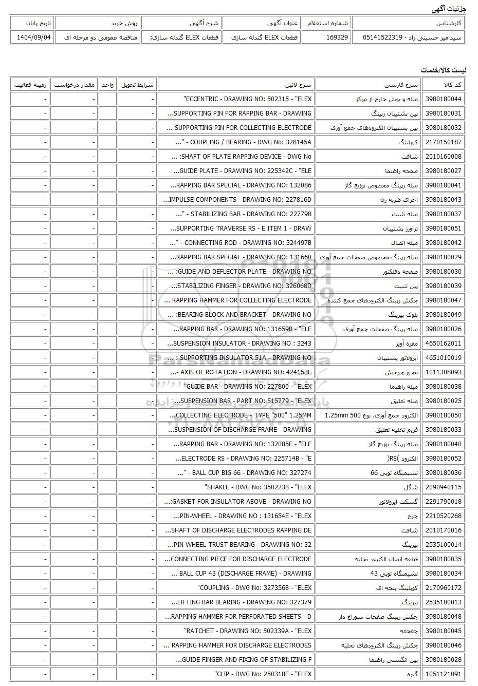 | سیدامیر حسینی راد - 05141522319 | 169329 | قطعات ELEX گندله سازی | قطعات ELEX گندله سازی; | مناقصه عمومی دو مرحله ای | 1404/09/04 |