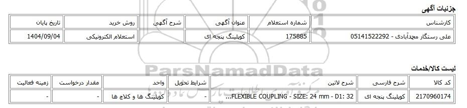 | علی رستگار محمدآبادی - 05141522292 | 175885 | کوپلینگ پنجه ای | استعلام الکترونیکی | 1404/09/04 |