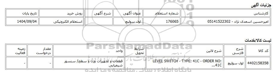 | 4402158358 | لول سوئیچ | LEVEL SWITCH - TYPE: 41C - ORDER NO: 41C... | قطعات و تجهیزات وزن و سطح/ سنسور شیمیایی | - | - |