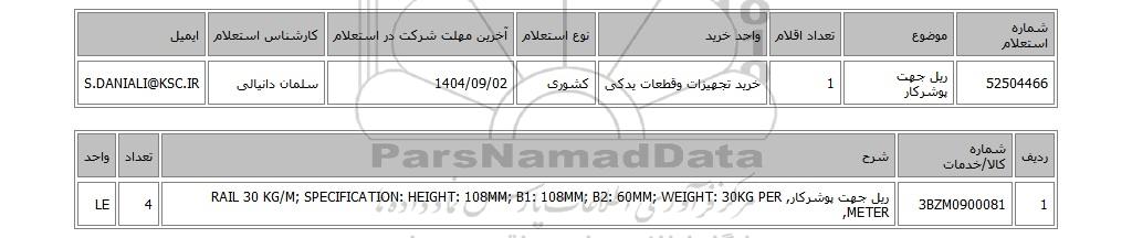 | 52504466 | ریل جهت پوشرکار | 1 | خرید تجهیزات وقطعات یدکی | کشوری | 1404/09/02 | سلمان دانیالی | S.DANIALI@KSC.IR |