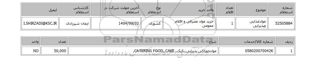 | 52505884 | موادغذایی وپذیرایی | 1 | خرید مواد مصرفی و اقلام عمومی | کشوری | 1404/09/02 | ایمان شیرزادی | I.SHIRZADI@KSC.IR |