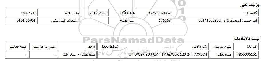 | امیرحسین اسعدی نژاد - 05141522302 | 176063 | منبع تغذیه | استعلام الکترونیکی | 1404/09/04 |