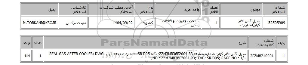 | 52505909 | سیل گس افتر کولر(اضطراری | 1 | ساخت تجهیزات و قطعات یدکی | کشوری | 1404/09/02 | مهدی ترکانی | M.TORKANI@KSC.IR |