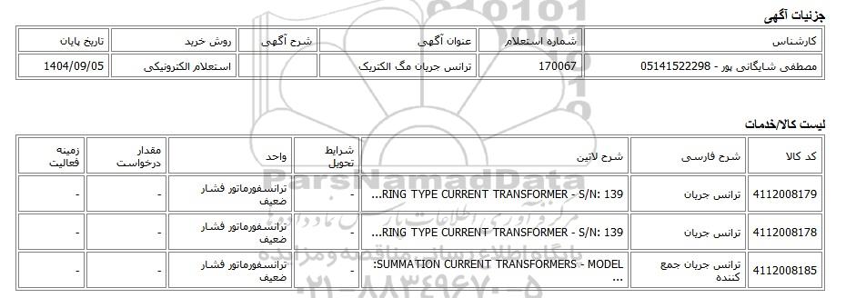 | مصطفی شایگانی پور - 05141522298 | 170067 | ترانس جریان مگ الکتریک | استعلام الکترونیکی | 1404/09/05 |