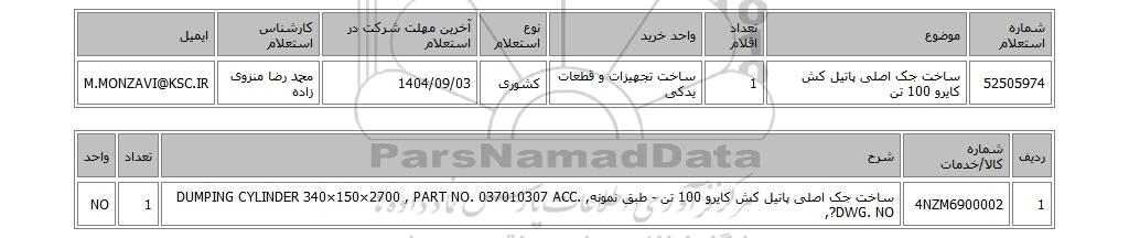 | 52505974 | ساخت جک اصلی پاتیل کش کایرو 100 تن | 1 | ساخت تجهیزات و قطعات یدکی | کشوری | 1404/09/03 | محمد رضا منزوی زاده | M.MONZAVI@KSC.IR |