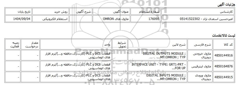 | امیرحسین اسعدی نژاد - 05141522302 | 176095 | ماژول های OMRON | استعلام الکترونیکی | 1404/09/04 |