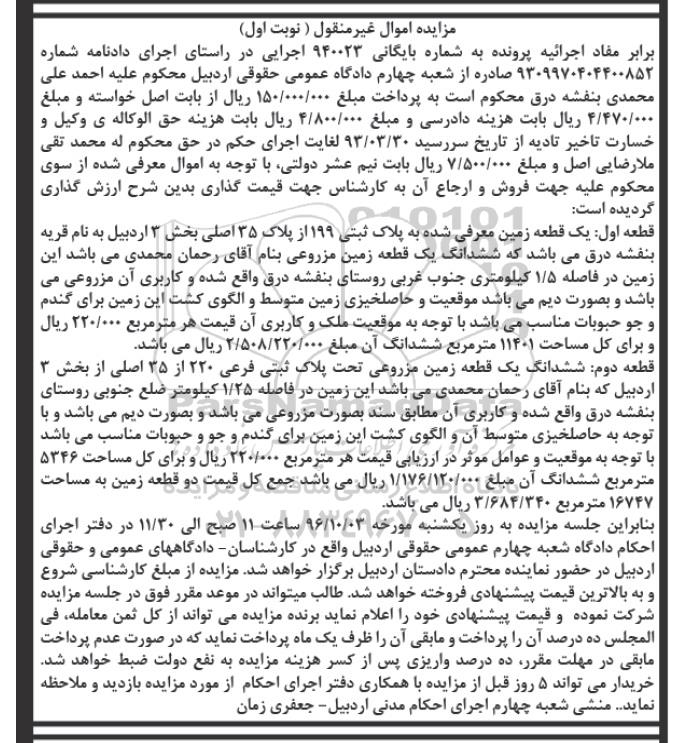 مزایده یک قطعه زمین مزروعی و ششدانگ یک قطعه زمین مزروعی بایگانی 940023 نوبت اول