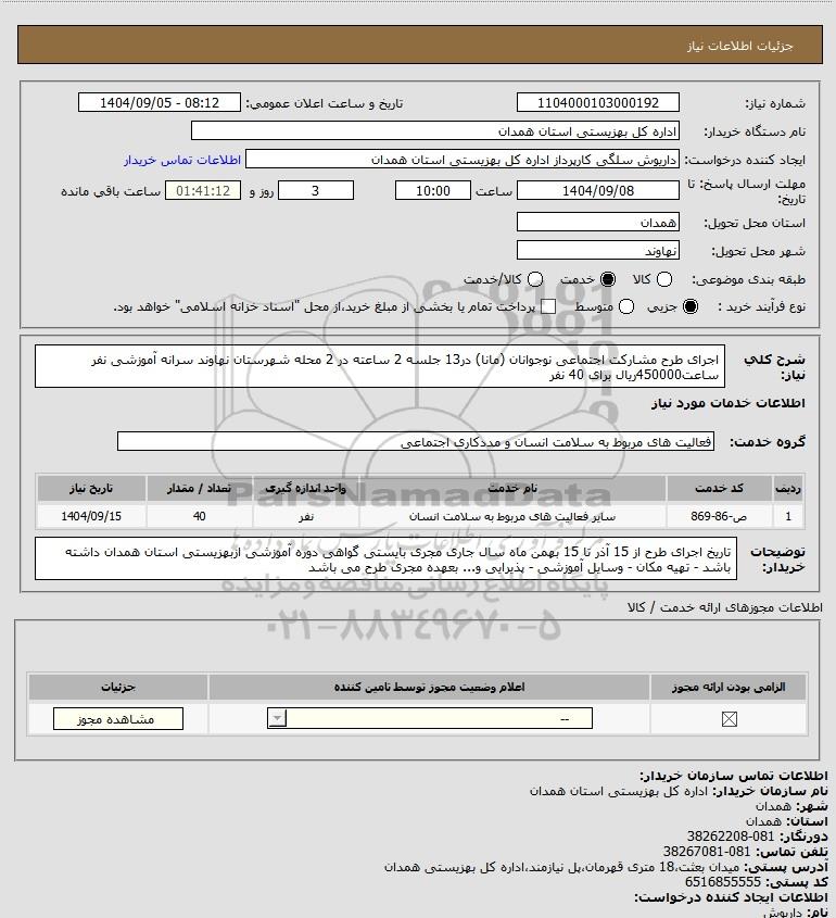 شرح کلی نیاز: اجرای طرح مشارکت اجتماعی نوجوانان (مانا) در13 جلسه 2 ساعته در 2 محله شهرستان نهاوند سرانه آموزشی نفر ساعت450000ریال برای 40 نفر