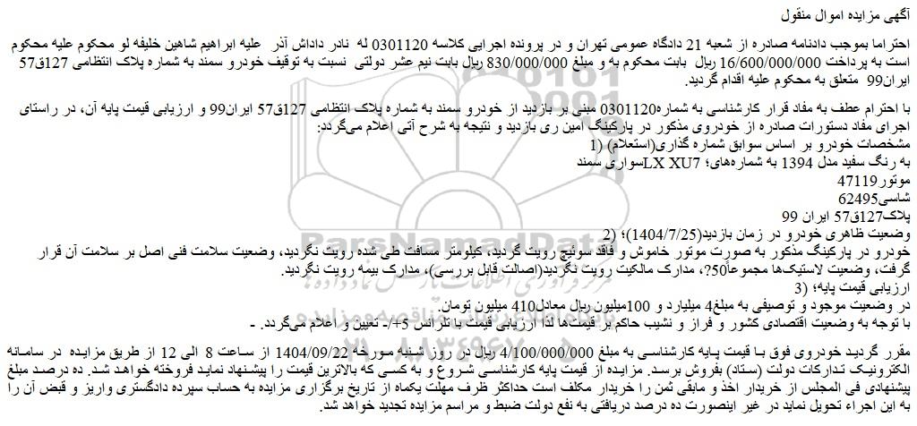 احتراما بموجب دادنامه صادره از شعبه 21 دادگاه عمومی تهران و در پرونده اجرایی کلاسه 0301120 له نادر داداش آذر علیه ابراهیم شاهین خلیفه لو محکوم علیه محکوم است به پرداخت 16/600/000/000 ریال بابت محکوم به و مبلغ 830/000/000 ریال بابت نیم عشر دولتی نسبت به توقیف خودرو سمند به شماره پلاک انتظامی 127ق57 ایران99 متعلق به محکوم علیه اقدام گردید.