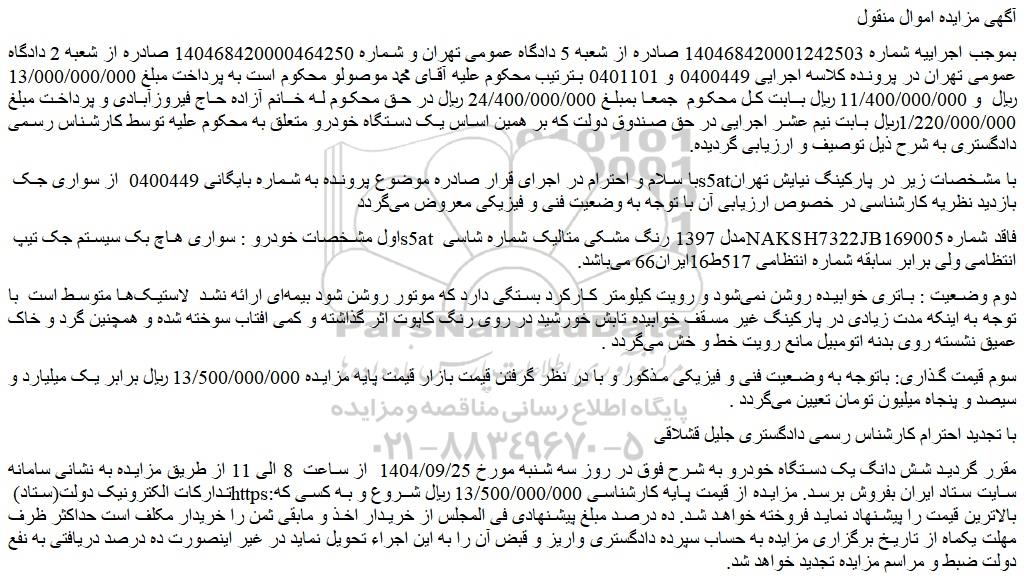 بموجب اجراییه شماره 140468420001242503 صادره از شعبه 5 دادگاه عمومی تهران و شماره 140468420000464250 صادره از شعبه 2 دادگاه عمومی تهران در پرونده کلاسه اجرایی 0400449 و 0401101 بترتیب محکوم علیه آقای محمد موصولو محکوم است به پرداخت مبلغ 13/000/000/000 ریال و 11/400/000/000 ریال بابت کل محکوم جمعا بمبلغ 24/400/000/000 ریال در حق محکوم له خانم آزاده حاج فیروزآبادی و پرداخت مبلغ 1/220/000/000ریال بابت نیم عشر اجرایی در حق صندوق دولت که بر همین اساس یک دستگاه خودرو متعلق به محکوم علیه توسط کارشناس رسمی دادگستری به شرح ذیل توصیف و ارزیابی گردیده.