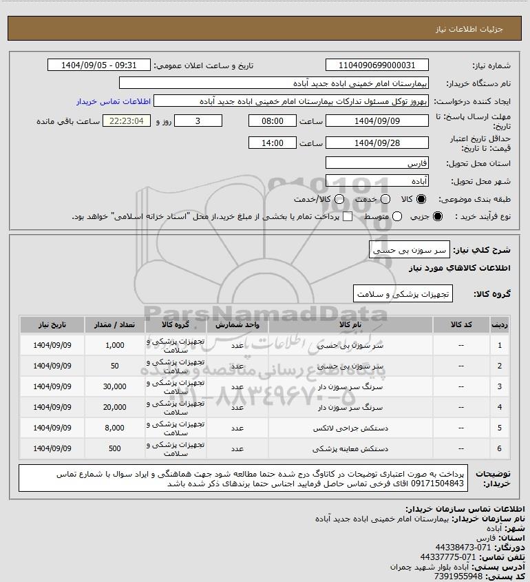 | 2 | -- | سر سوزن بی حسی | عدد | تجهیزات پزشکی و سلامت | 50 | 1404/09/09 |