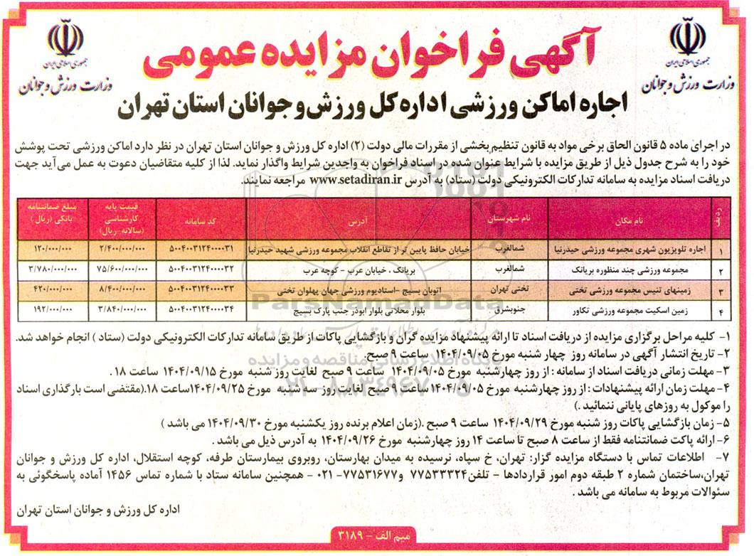در اجرای ماده 5 قانون الحاق برخی مواد به قانون تنظیم بخشی از مقررات مالی دولت (2) اداره کل ورزش و جوانان استان تهران در نظر دارد اماکن ورزشی تحت پوشش خود را به شرح جدول ذیل از طریق مزایده با شرایط عنوان شده در اسناد فراخوان به واجدین شرایط واگذار نماید. لذا از کلیه متقاضیان دعوت به عمل می آید جهت دریافت اسناد مزایده به سامانه تدارکات الکترونیکی دولت (ستاد) به آدرس ستاد ایران مراجعه نمایند.